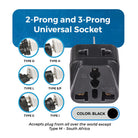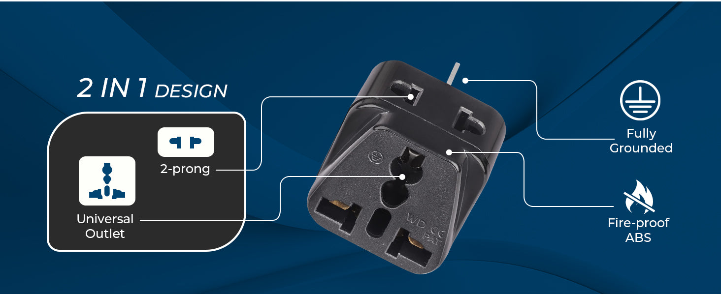 This adapter features a 2-in-1 input design, allowing two electrical devices to be connected at the same time. The universal input accepts plugs from most countries, while the secondary input supports standard 2-pin plugs, offering flexibility when charging multiple devices.