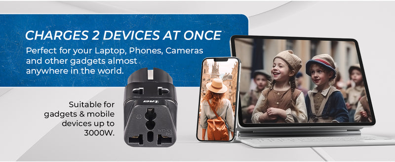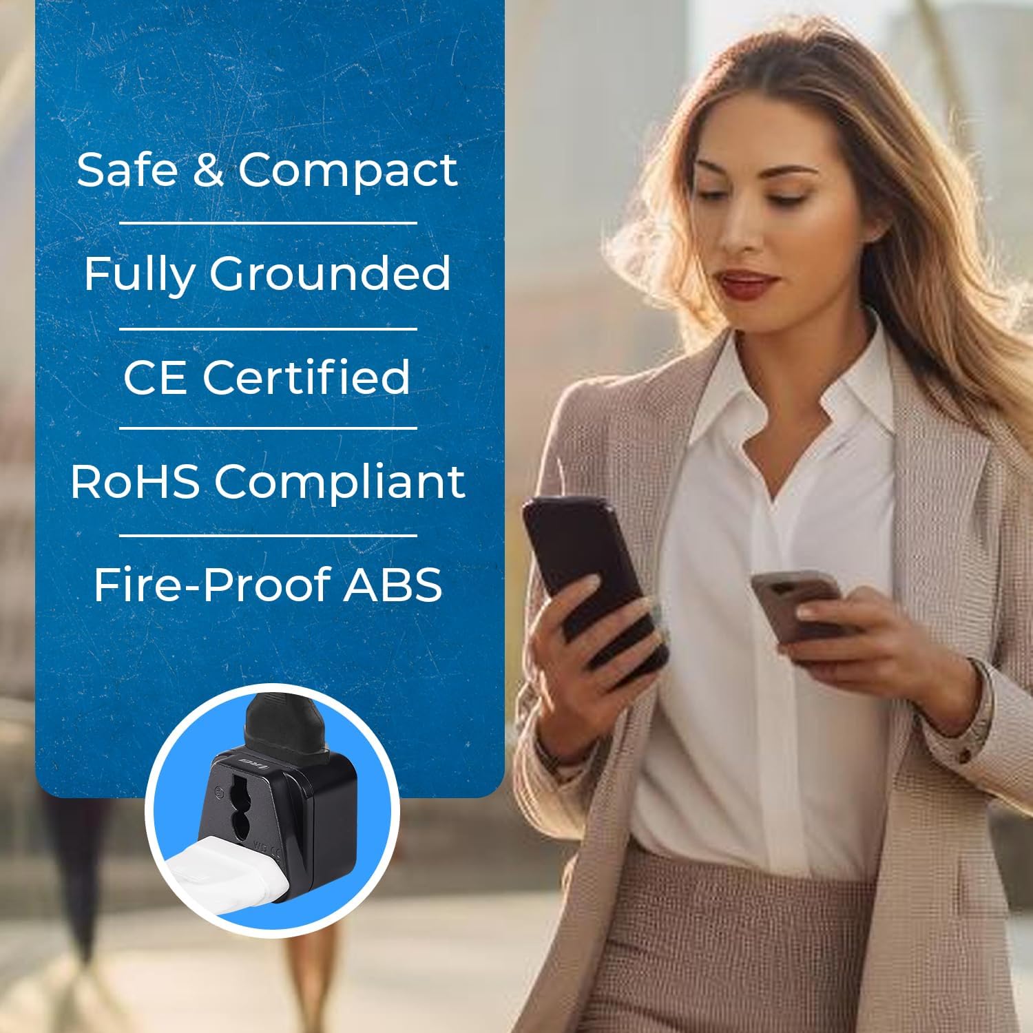 Equipped with a 3-pin round prong grounded design, the adapter supports a maximum load of up to 3000 W (250 V, 10 A). This makes it suitable for devices such as laptops, camera and battery chargers, smartphones, tablets, Bluetooth speakers, power banks, and other low-to-medium-power electronics commonly used while traveling.