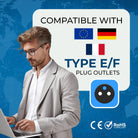This adapter accepts plugs from most countries through its universal input (excluding Type M – large South Africa 8.7 mm plugs). The secondary input supports 2-prong plugs from any country. It converts Indian plugs to a grounded Type E/F (CEE 7/4 or CEE 7/5) European output, compatible with Schuko sockets commonly used across Europe.