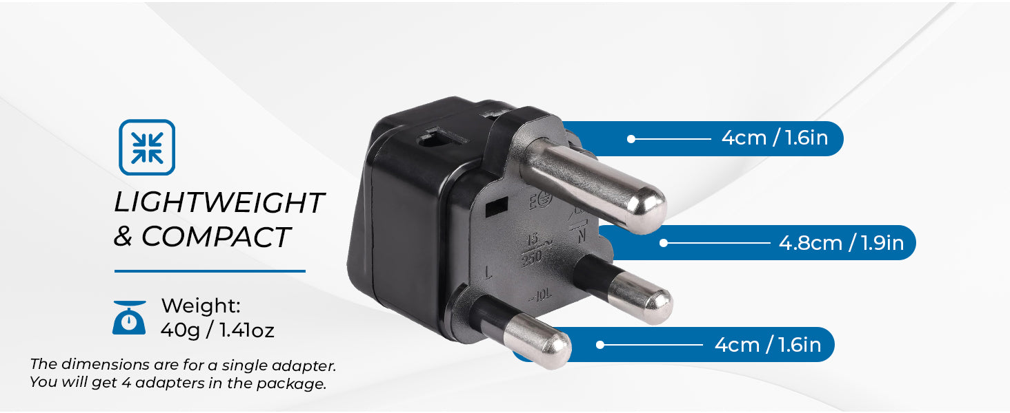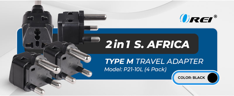The P21-10L-4PK is designed in the US and it’s our top choice for travel adapter to use in Type M outlets. It's compatible for use with dual voltage or worldwide voltage devices .It features one socket to connect a N. American 2-prong or a 3-prong power cord to charge your devices.