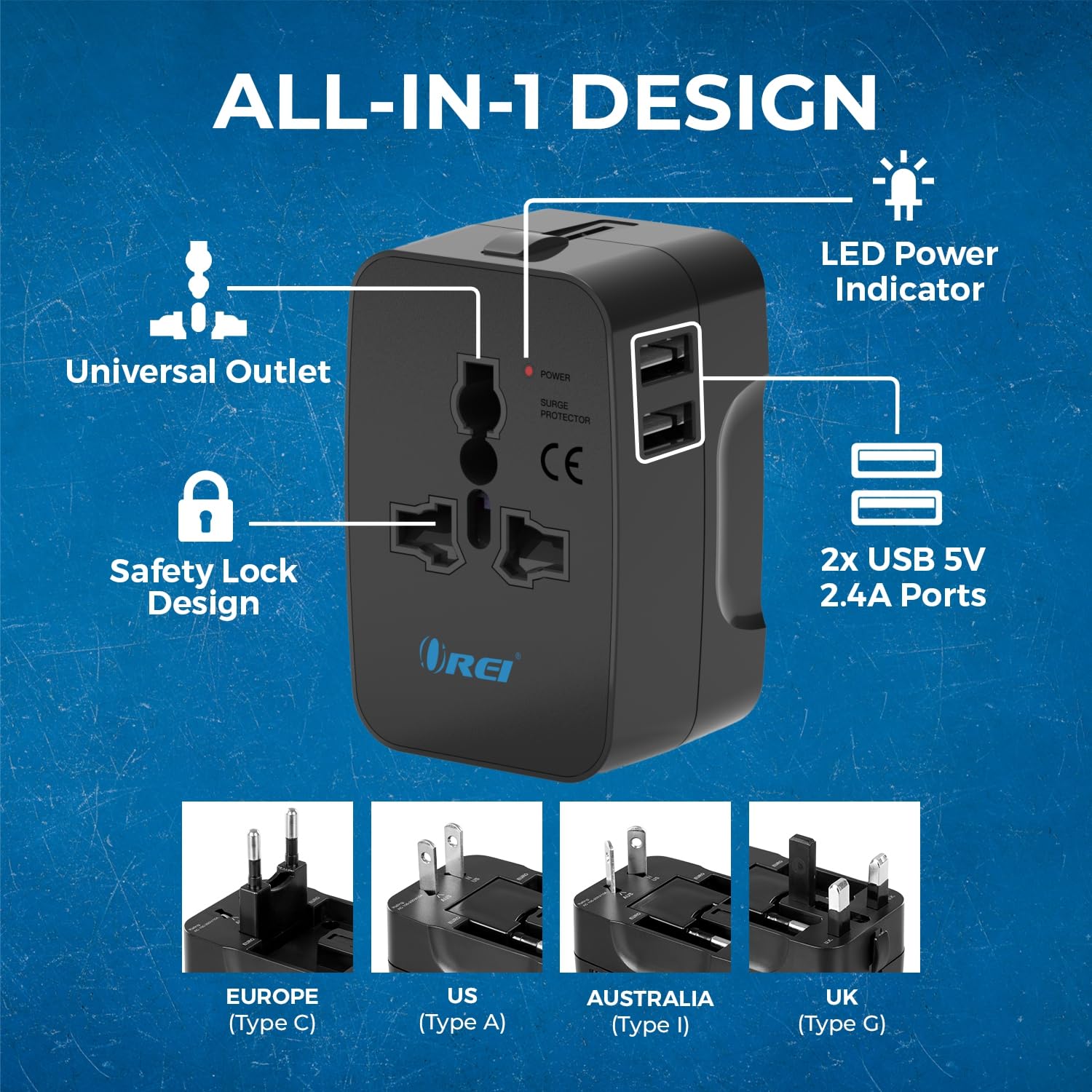 OREI 5-in-1 Universal Travel Adapter with 2 USB-A & 2 USB-C (M13)