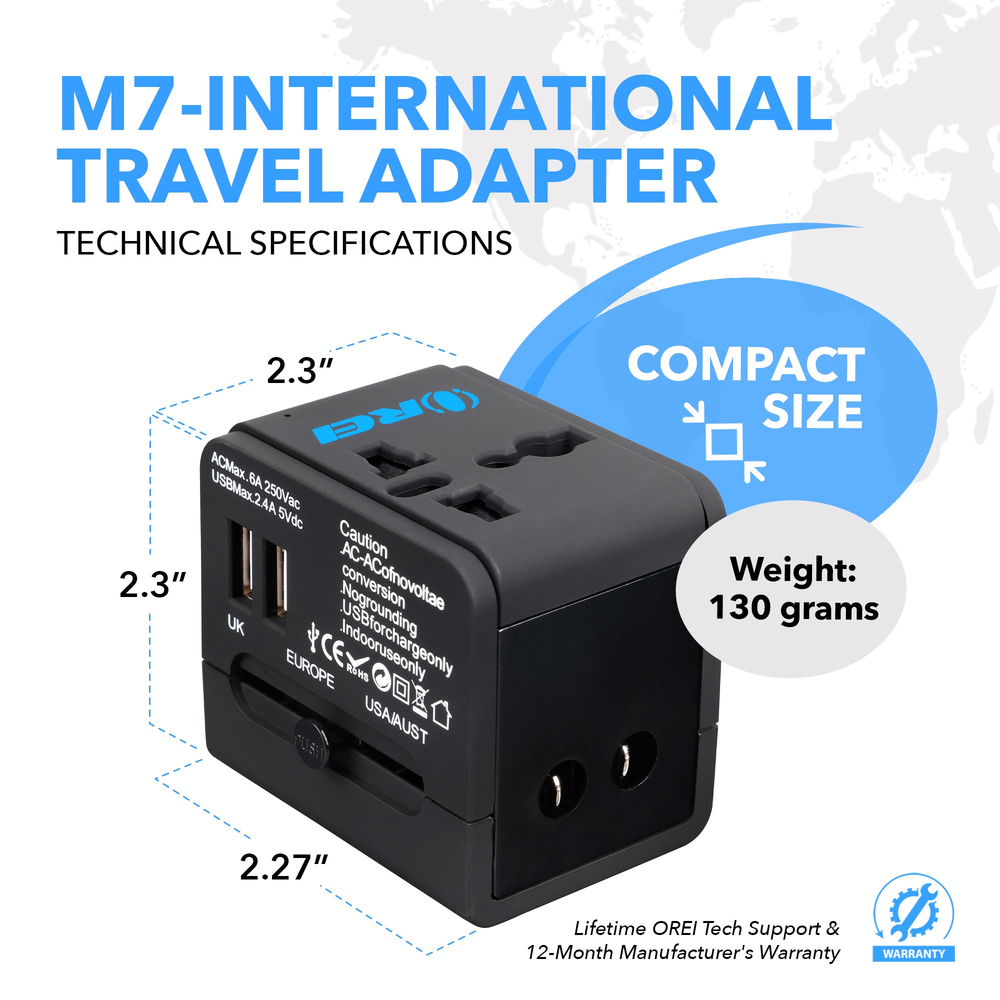 OREI Universal Travel Adapter with 2 USB Ports With Surge Protection (M7U)