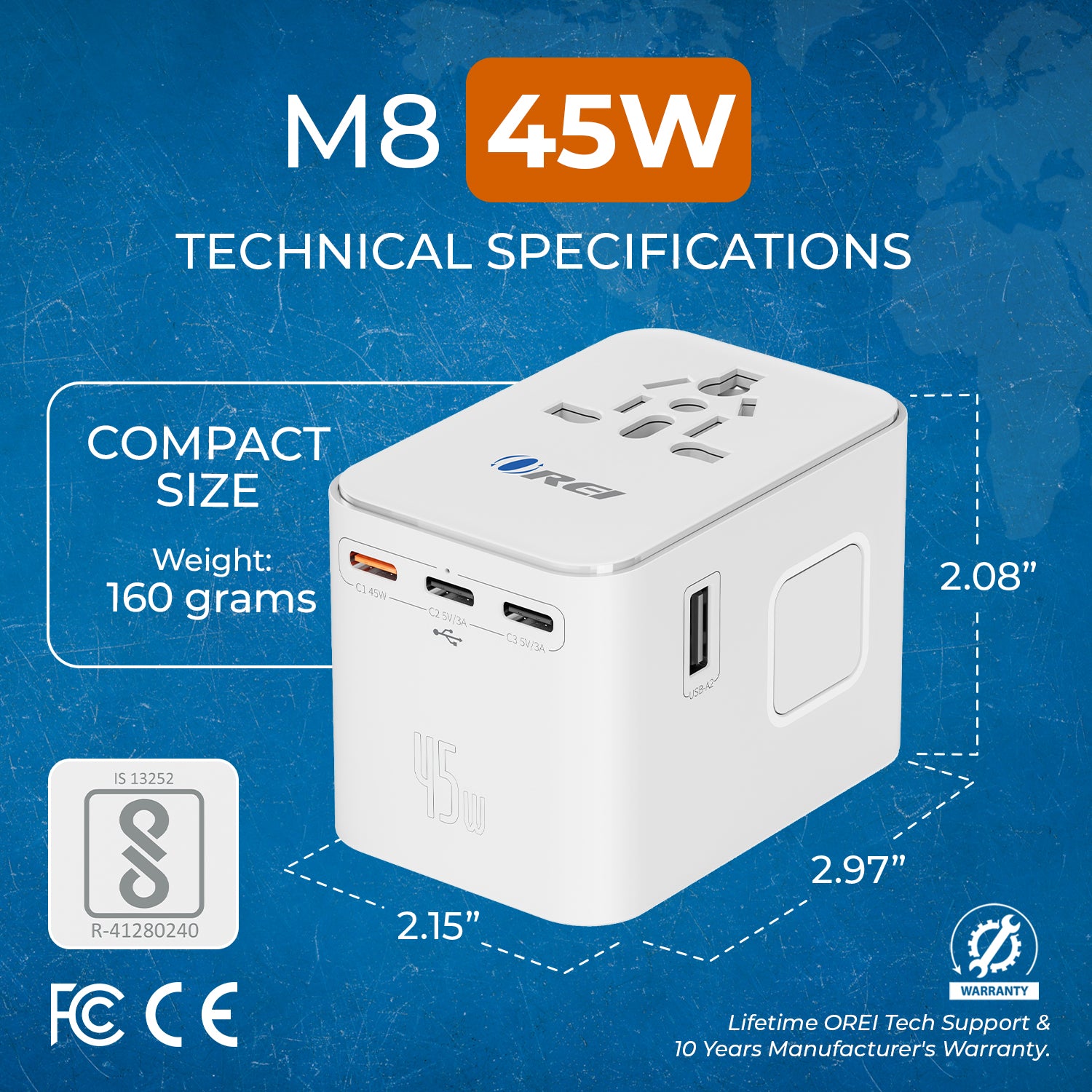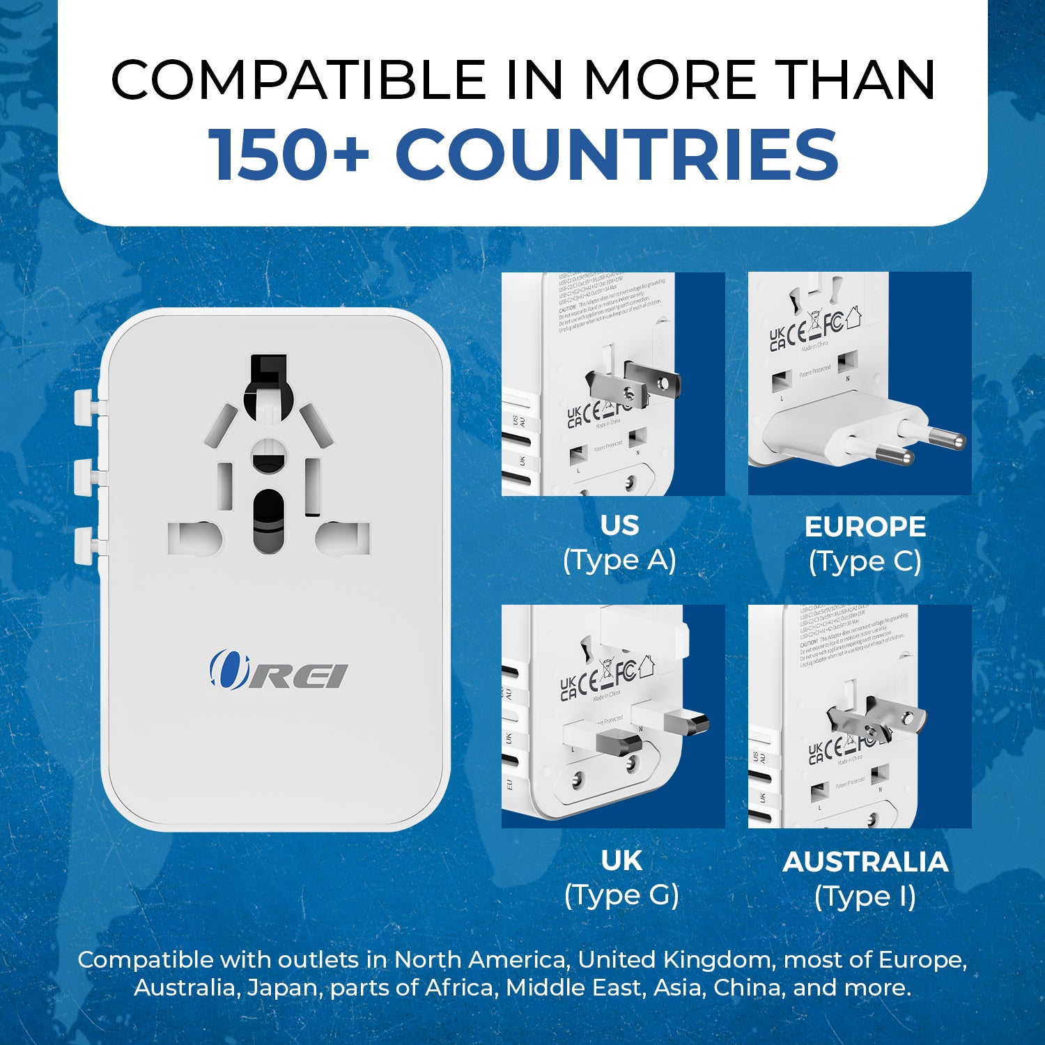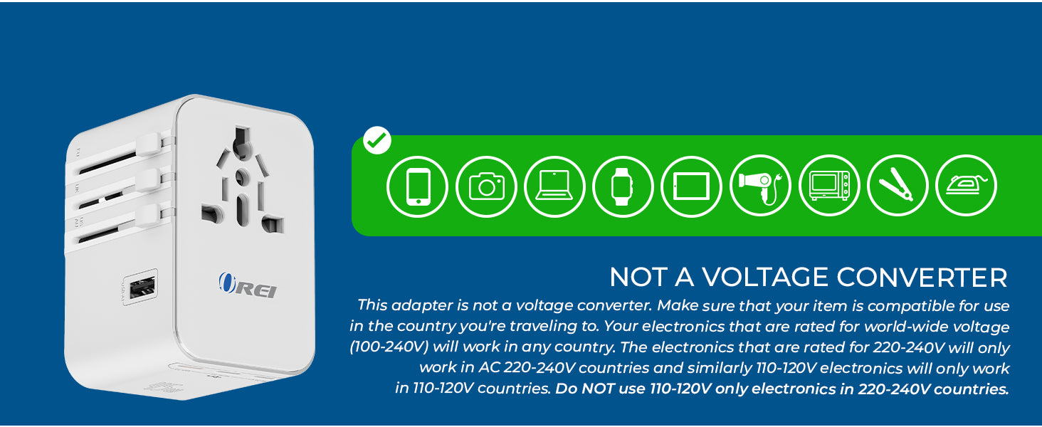 Built with safety as a priority, the adapter includes surge protection, fuse protection, safety shutters, and a plug-lock mechanism. It is CE, FCC, and RoHS certified, meeting international safety standards. The adapter operates within a 100–240V input range but does not convert voltage. Devices must support the local voltage standard for safe operation. Designed for dependable use, it is backed by OREI support.