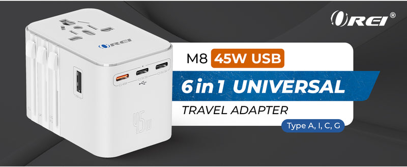 The OREI M8-45W-White Universal Travel Adapter is a powerful 6-in-1 charging solution designed for modern travelers who need fast, reliable power across the globe. Featuring 3 USB-C PD ports, 2 USB-A ports, and 1 universal AC outlet, it allows you to charge up to six devices simultaneously, including laptops, tablets, smartphones, cameras, and other essential travel electronics. With a 45W fast power delivery output and intelligent Smart IC technology, the adapter automatically adjusts power to ensure safe, efficient, and optimized charging for every connected device. Supporting plug types A, C, G, and I, it works in 150+ countries with a wide 100–240V input range, making it an ideal companion for international travel.