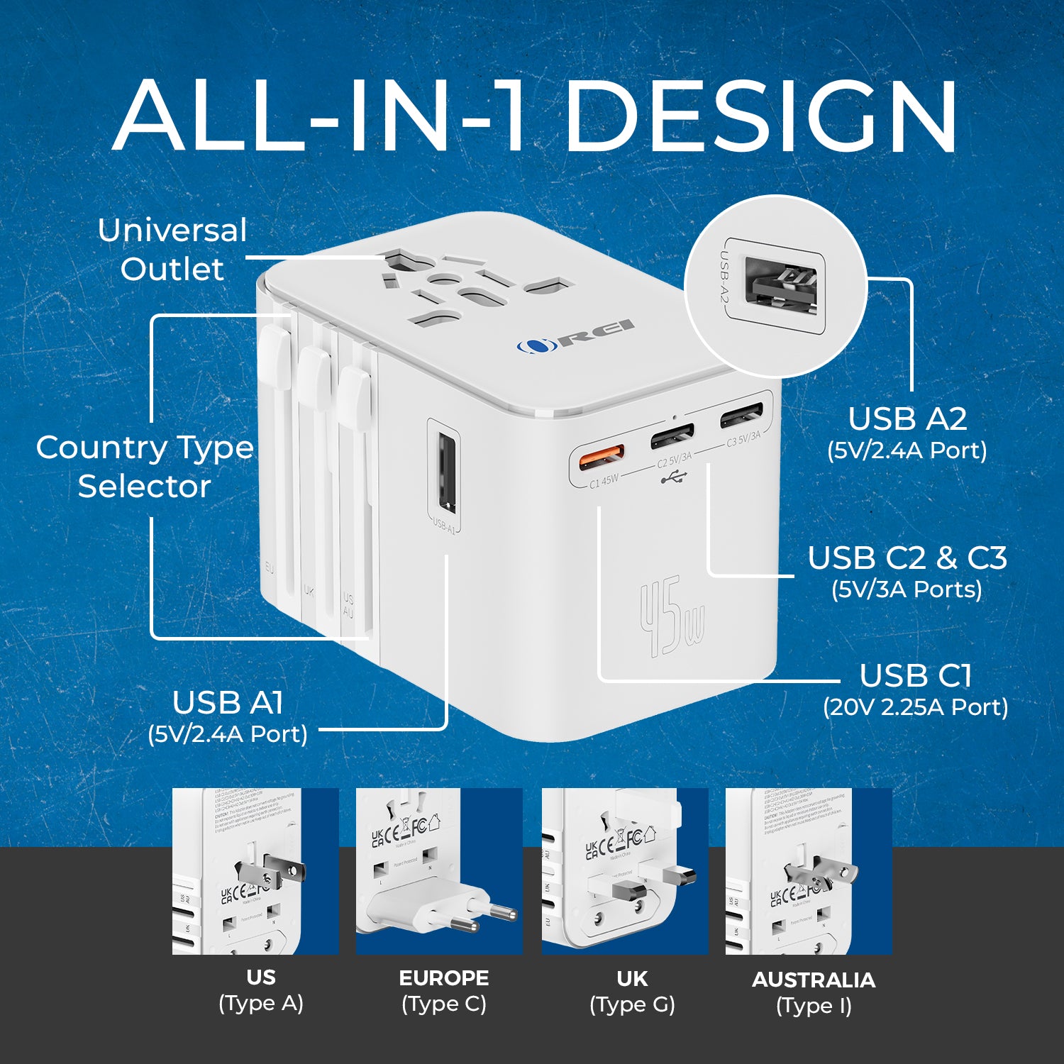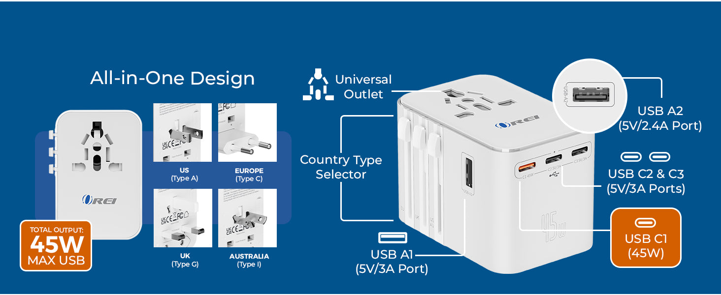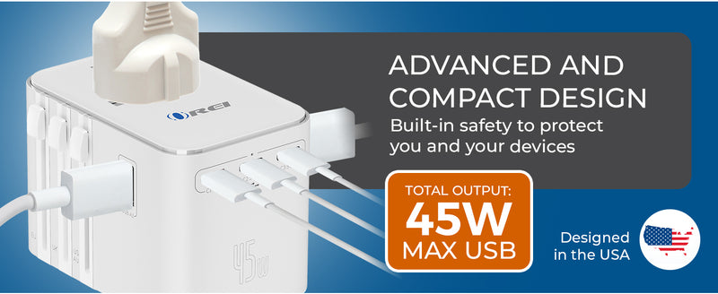 OREI 45W Universal Travel Adapter – Compact 6-in-1 Charger for Safe & Reliable Travel