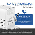Safety and reliability are built into every detail. The adapter is CE, FCC, and RoHS certified and includes built-in surge protection, an 8A fuse with a spare, safety shutters, and a secure plug-lock system to help protect your devices from electrical risks. Designed in the USA with a sleek black finish, its lightweight yet durable construction fits easily into any travel bag. Backed by a 1-year OREI warranty, this universal travel adapter delivers dependable performance and peace of mind wherever your journey takes you.