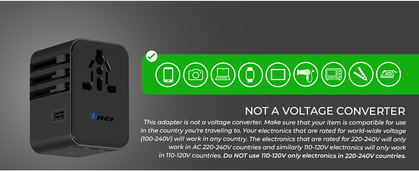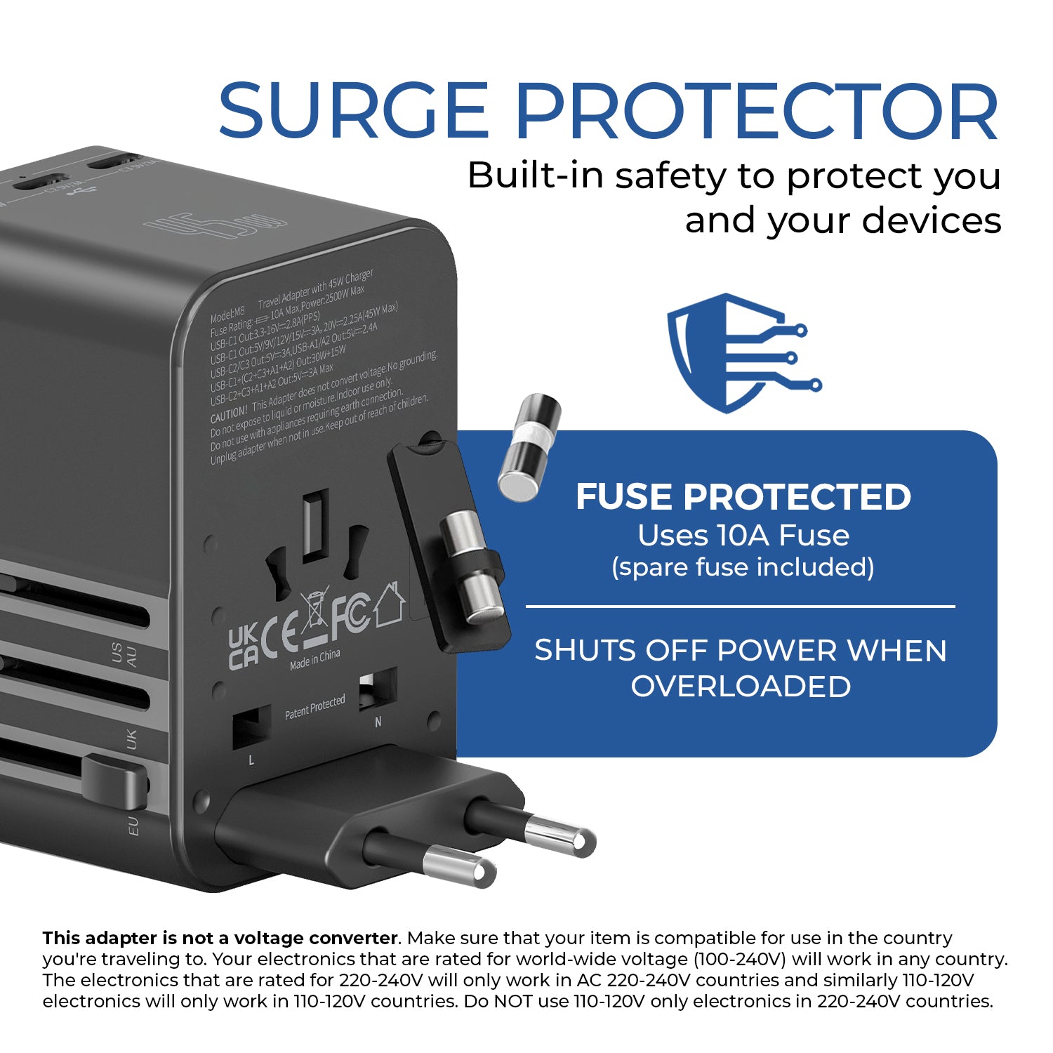 Safety and reliability are built into every detail. The adapter is CE, FCC, and RoHS certified and includes built-in surge protection, an 8A fuse with a spare, safety shutters, and a secure plug-lock system to help protect your devices from electrical risks. Designed in the USA with a sleek black finish, its lightweight yet durable construction fits easily into any travel bag. Backed by a 1-year OREI warranty, this universal travel adapter delivers dependable performance and peace of mind wherever your journey takes you.