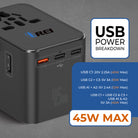 The OREI M8-45W-Black Universal Travel Adapter is a powerful 6-in-1 charging solution designed for modern travelers who need fast, reliable power across the globe. Featuring 3 USB-C PD ports, 2 USB-A ports, and 1 universal AC outlet, it allows you to charge up to six devices simultaneously, including laptops, tablets, smartphones, cameras, and other essential travel electronics. With a 45W fast power delivery output and intelligent Smart IC technology, the adapter automatically adjusts power to ensure safe, efficient, and optimized charging for every connected device. Supporting plug types A, C, G, and I, it works in 150+ countries with a wide 100–240V input range, making it an ideal companion for international travel.