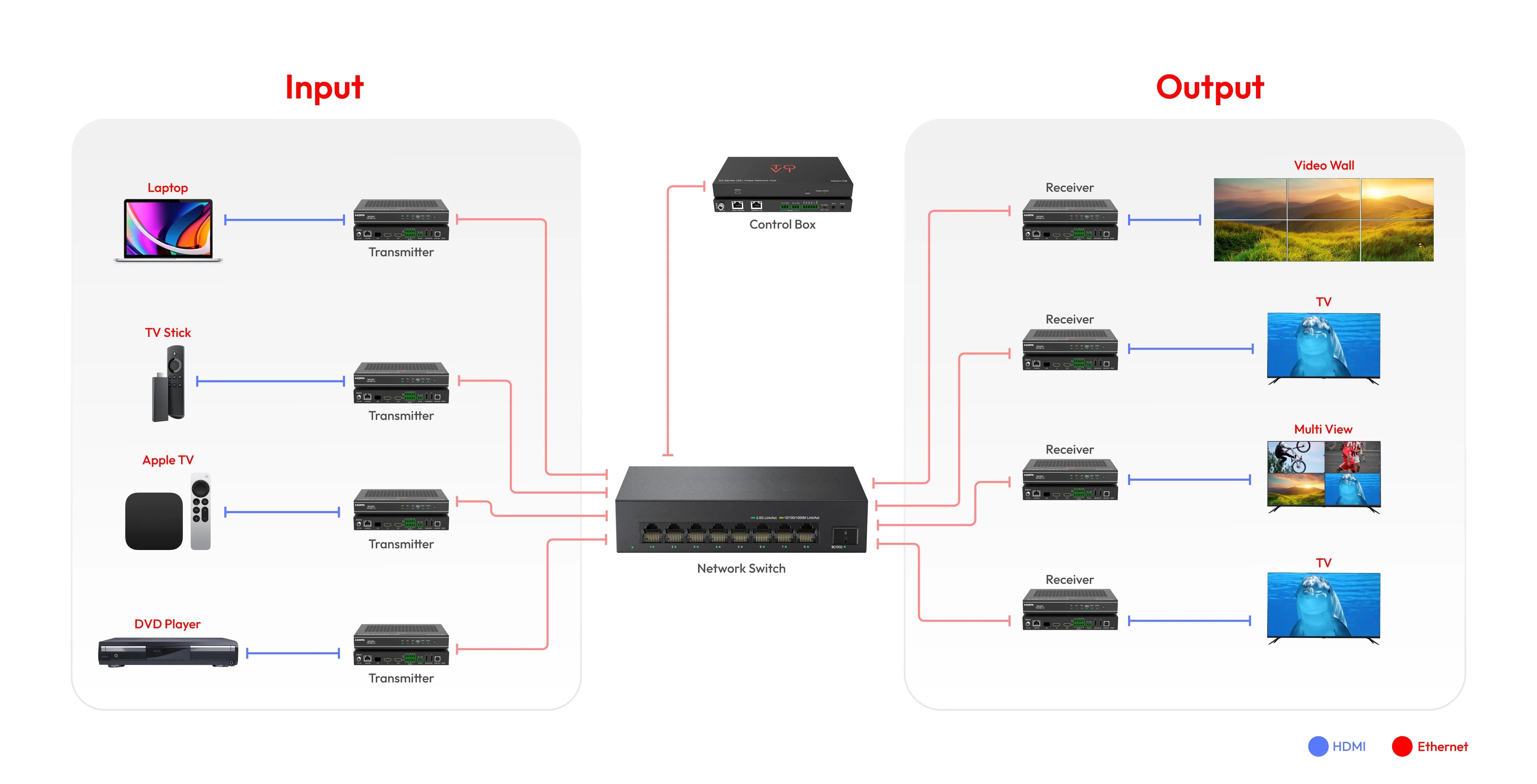Unlike traditional point-to-point AV systems, ToVi uses IP-based infrastructure, enabling multiple devices to connect and communicate over a standard 1G network. This makes it easier to expand, control, and manage large-scale AV deployments using fewer cables and more flexible configurations.