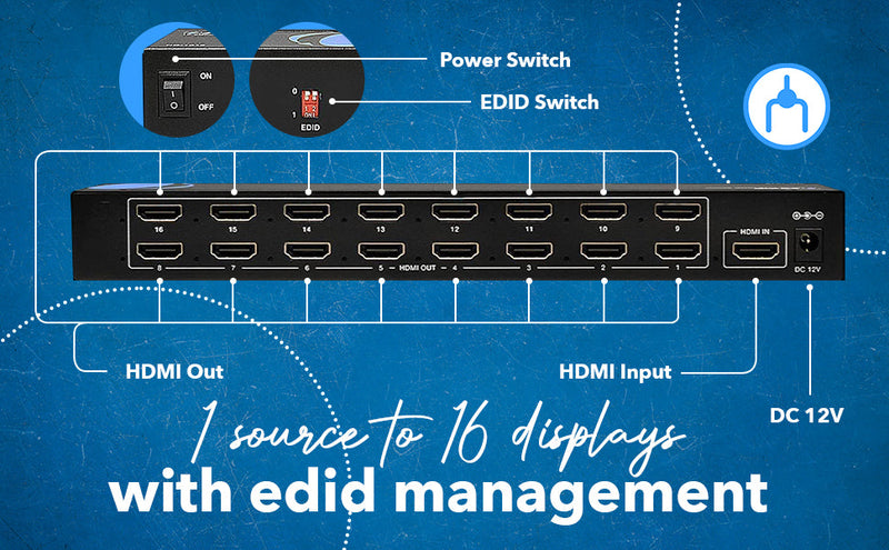 With four selectable EDID modes, this splitter provides flexible signal management for various display types. Whether you're using it as a splitter for multiple monitors or in a multi-display configuration, the HD-1016 offers the ability to choose from 1080p@60Hz, 4K@30Hz, or automatic modes to match your specific setup. This ensures optimal compatibility with all connected devices, making it ideal for environments where diverse display devices are used.