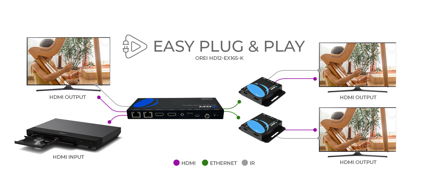 The HD12-EX165-K is a professional-grade HDMI extender splitter 1x2 that transmits a single HDMI source to two displays—one local and one remote—using CAT6/7 cable. Supporting 4K@30Hz up to 165 feet and 1080p@60Hz up to 230 feet, this system ensures high-definition video quality and seamless transmission for home theaters, classrooms, or retail installations.