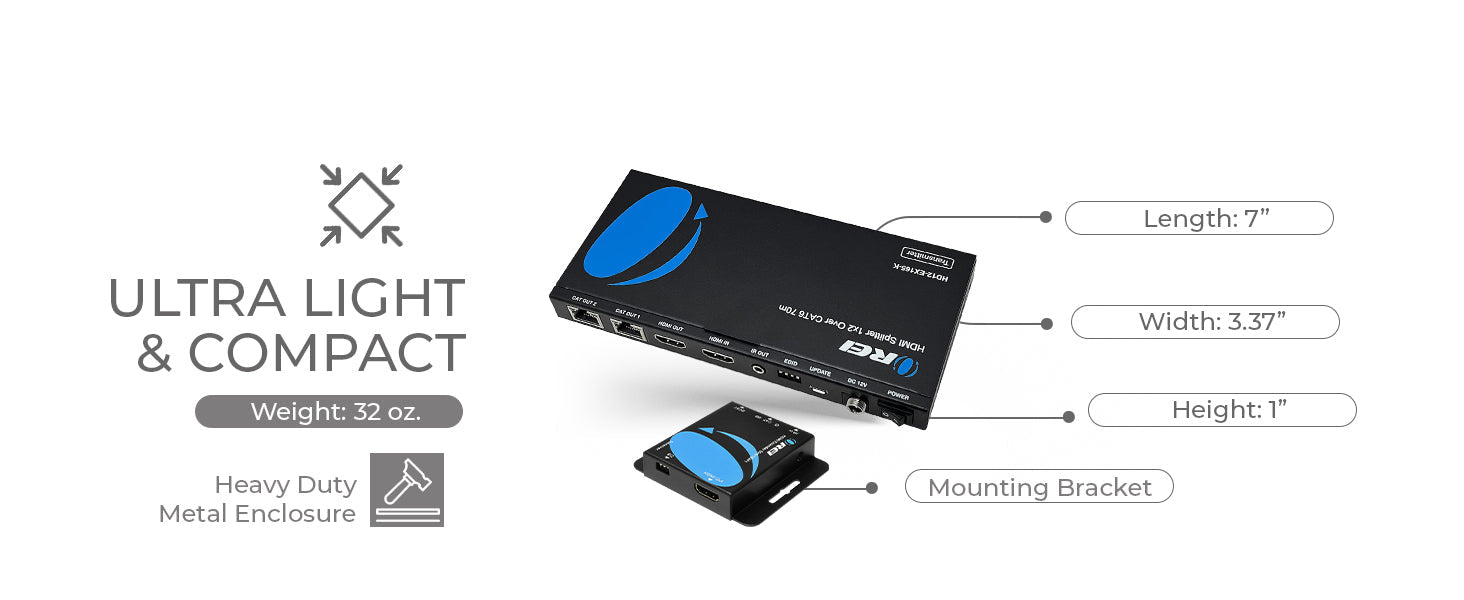 The HD12-EX165-K HDMI Extender Splitter provides a reliable solution for distributing one HDMI source to two displays over long distances. Utilizing a single CAT6/7 cable, it extends 4K@30Hz video up to 165 feet and 1080p@60Hz up to 230 feet with zero latency and uncompressed signal quality. It supports advanced audio formats including LPCM 7.1,