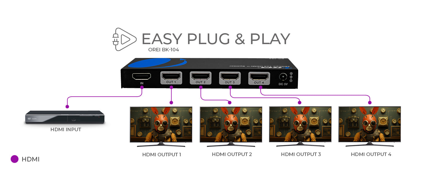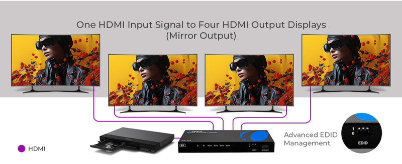 OREI BK-104 :8K 1x4 HDMI Splitter With Downscaling & EDID management, HDR, HLG & Dolby Vision Support
