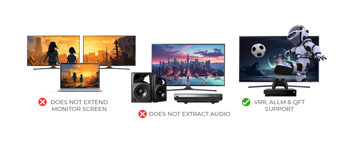 Enjoy smooth, dynamic visuals with support for VRR, ALLM, QMS, QFT, and SBTM—ideal for high-performance gaming and fast-paced content. Advanced EDID management allows precise signal negotiation across devices, while the compact design makes this 8K splitter easy to install in tight spaces, making it a reliable laptop screen splitter or AV distribution tool.