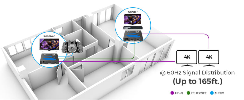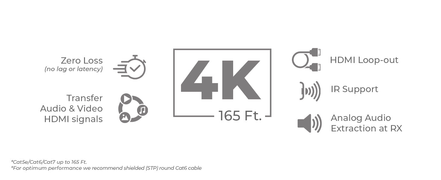 Transmission up to 230 ft (70 m) – Extends HDMI up to 165 ft (50 m) at 4K@60Hz and up to 230 ft with shielded CAT6/6a/7 cables.