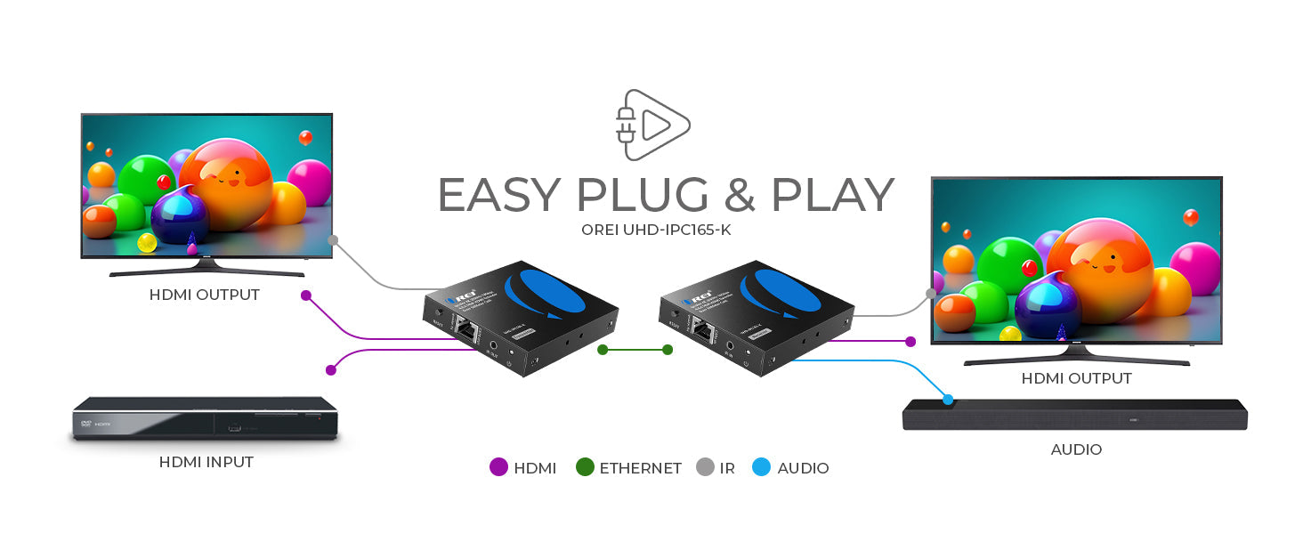 The UHD-IPC165-K offers dependable HDMI extension up to 165 feet (50 meters) at 4K@60Hz and up to 230 feet (70 meters) using shielded CAT6/6a/7 cables. Fully compliant with HDMI 2.0 and HDCP 2.2, it ensures compatibility with today's high-resolution sources and content protection protocols—ideal for modern home theaters, conference rooms, and AV installations.