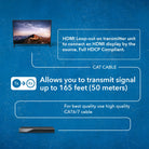 It supports distances up to 165 feet (50 meters) for 4K signals, and up to 230 feet (70 meters) with shielded cables at lower resolutions. This extender features an HDMI loop output on the transmitter for a local display, and L/R audio extraction from the receiver. Uni-directional IR pass-through enables control of the source device from the remote display location.