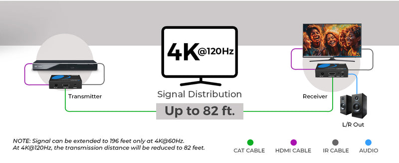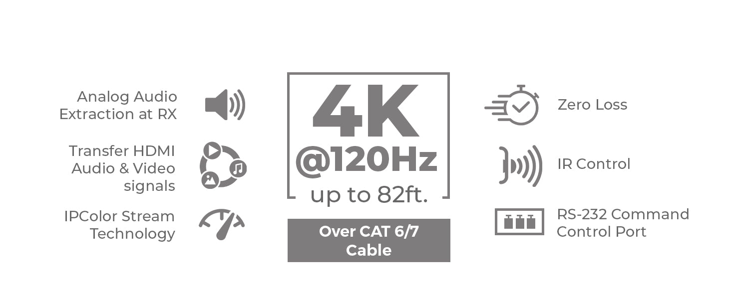 Long-Distance Transmission – Extends 4K@120Hz up to 30 m (100 ft) and 4K@60Hz up to 60 m (200 ft) via a single Cat6/6a/7 cable.