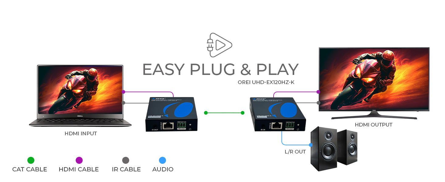 The UHD-EX120HZ-K HDMI Extender delivers ultra-high-definition video and audio over long distances using a single Cat6/6a/7 cable. Fully compliant with HDMI 2.0 and HDCP 2.2, it supports cutting-edge AV equipment and protected content up to 4K@120Hz resolution. Whether you're upgrading a home theater or building out a commercial AV system, this extender ensures exceptional visual clarity with plug-and-play ease.