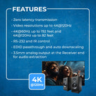 The UHD-EX120HZ-K automatically adjusts 4K video to 1080p when needed, enabling smooth operation with mixed-resolution displays. EDID passthrough ensures accurate communication between source and display, while HDR support provides vibrant color and contrast. The receiver includes a 3.5mm audio output for connecting external sound systems without additional hardware.