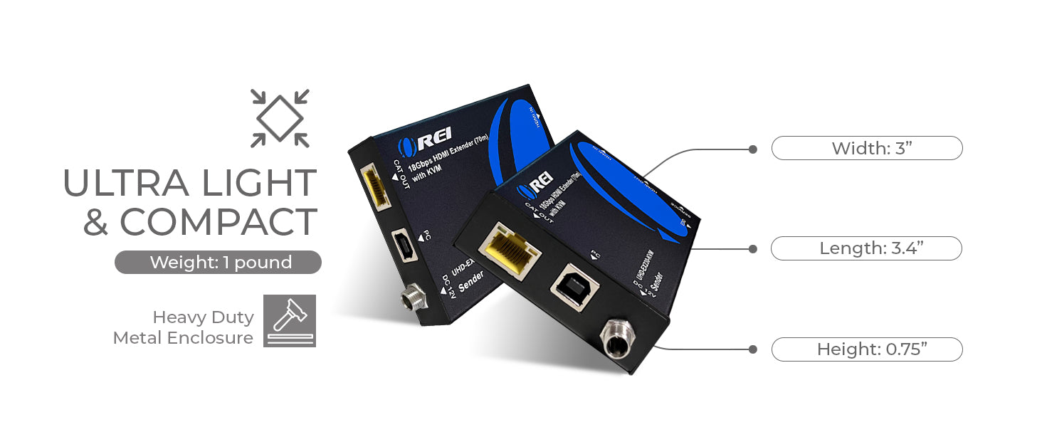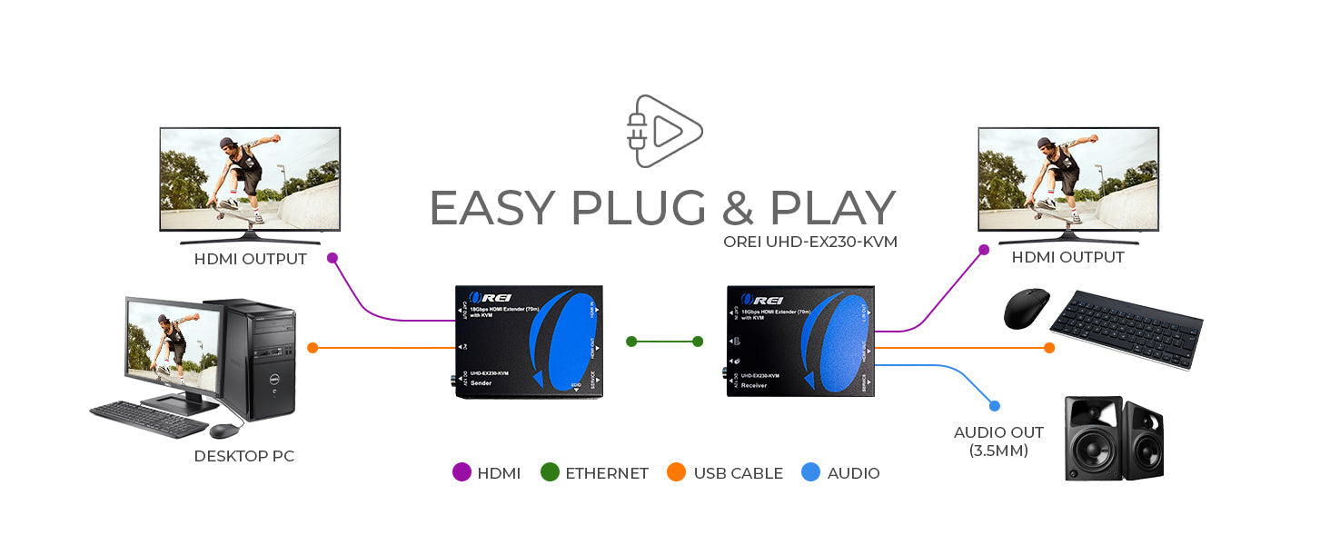OREI 4K KVM Extender over Ethernet up to 230 feet - With Audio extraction & Bi-directional Power over Cable