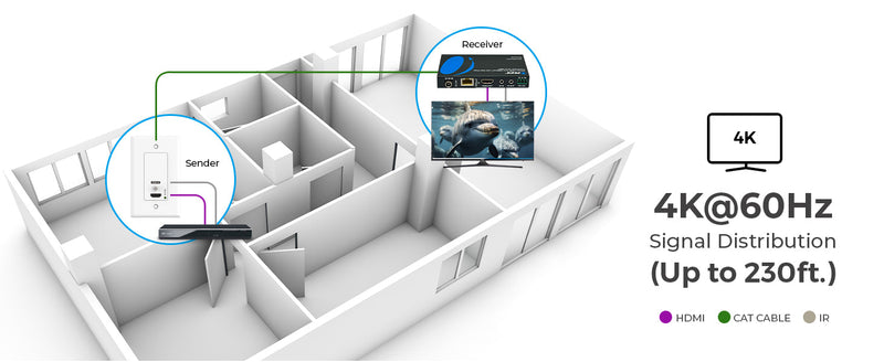 Equipped with HDBaseT, this extender ensures lossless, low-latency AV transmission over long distances—up to 130 feet at 4K@60Hz, or 230 feet at 1080p@60Hz. Whether you're extending content in a smart home or a large meeting space, the signal remains crisp and stable.