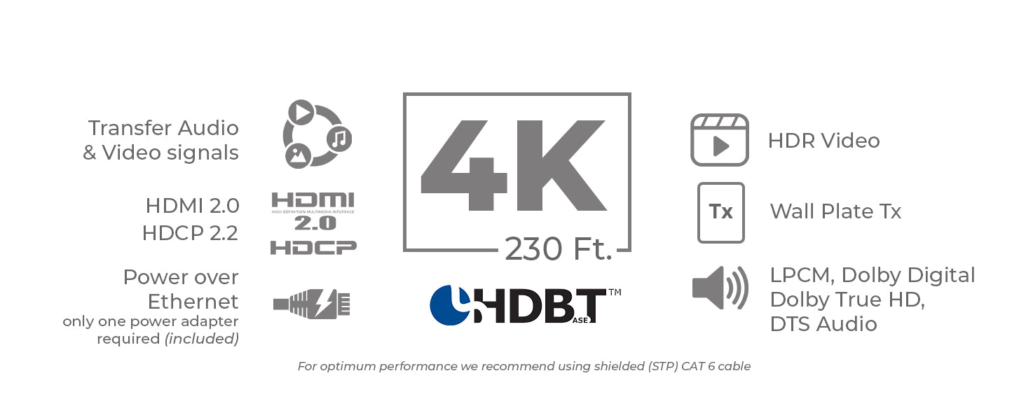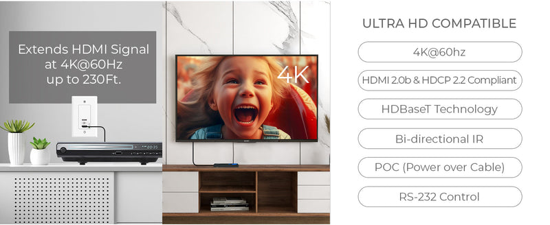 HDBaseT Technology – Provides reliable, lossless transmission over a single cable.