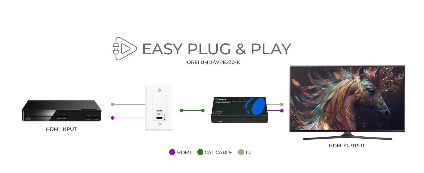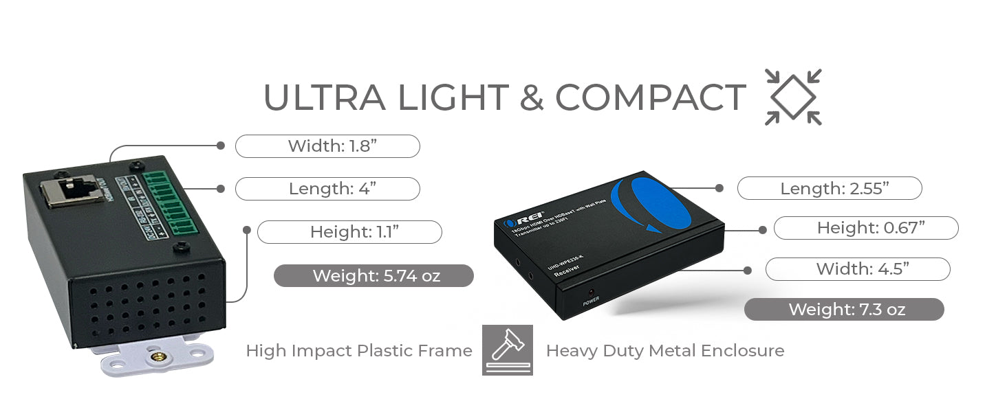 The OREI UHD-WPE230-K allows you to transmit HDMI signals up to 230 feet using a single CAT 6/6a/7 cable—perfect for home theaters, classrooms, and conference rooms. It supports HDMI 2.0 and HDCP 2.2, ensuring seamless playback of modern 4K@60Hz (4:4:4) content with 18Gbps video bandwidth and zero compression.