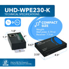 The UHD-WPE230-K HDBaseT Wall Plate Extender is a professional-grade solution for extending HDMI signals over long distances using a single CAT 6/6a/7 cable. Designed with a US Decora wall plate form factor, the transmitter fits directly into the wall for a clean, integrated installation. It supports HDMI 2.0 and HDCP 2.2 standards, delivering resolutions up to 4K@60Hz (4:4:4) and 18Gbps video bandwidth for pristine picture quality. Media can be extended up to 130 feet at 4K@60Hz or up to 230 feet at 1080p@60Hz, making it suitable for conference rooms, classrooms, and residential AV setups. With Power over Cable (PoC) support, only one power adapter is needed at either the transmitter or receiver end. This model also includes bidirectional IR and RS-232 pass-through for full system control.