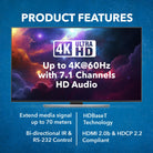 Long-Distance Extension – Transmits 4K@60Hz up to 130 feet and 1080p@60Hz up to 230 feet.