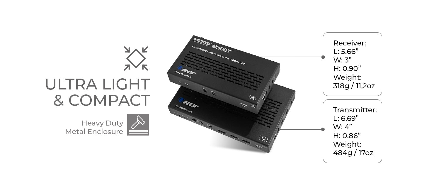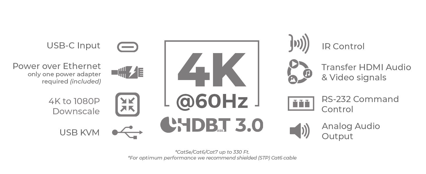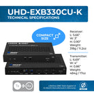 Installation is streamlined with Power over Cable (PoC), requiring only one power adapter for both units. Bi-directional IR control lets users manage either the source or the display from either end of the system. Whether you're setting up a home office, conference room, or commercial AV solution, the UHD-EXB330CU-K is a robust HDMI via Ethernet extender with USB-C flexibility and advanced feature integration.