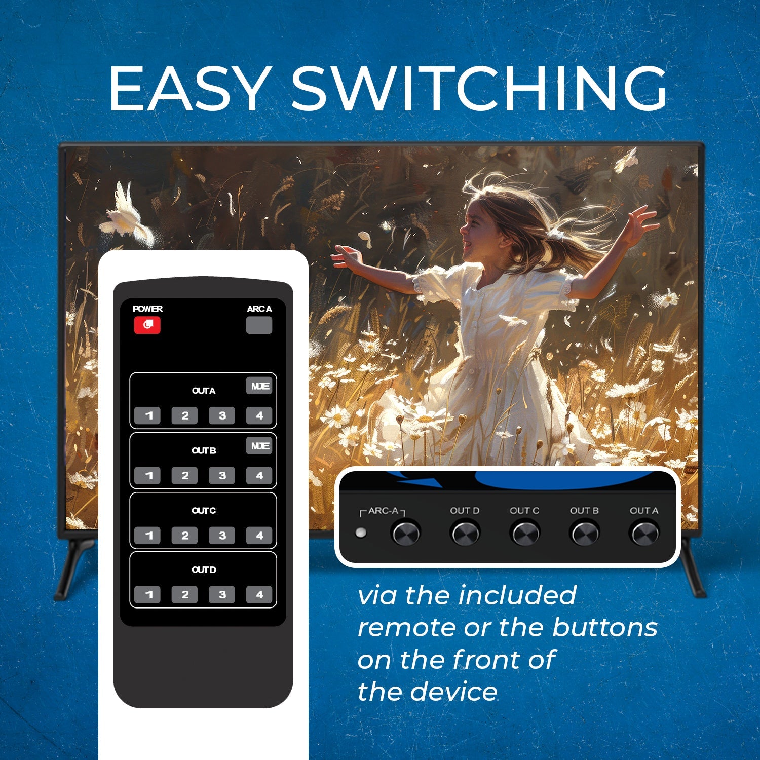 For added flexibility, the UHD-404R includes dedicated Optical (SPDIF) and Analog stereo audio outputs for HDMI Outputs A and B, allowing for separate audio extraction to external sound systems. Output A also supports ARC (Audio Return Channel), enabling audio to be sent from ARC-enabled TVs back to an amplifier or soundbar. In 1x4 splitter mode, the unit offers intelligent 4K to 1080p downscaling, ensuring compatibility with legacy displays.