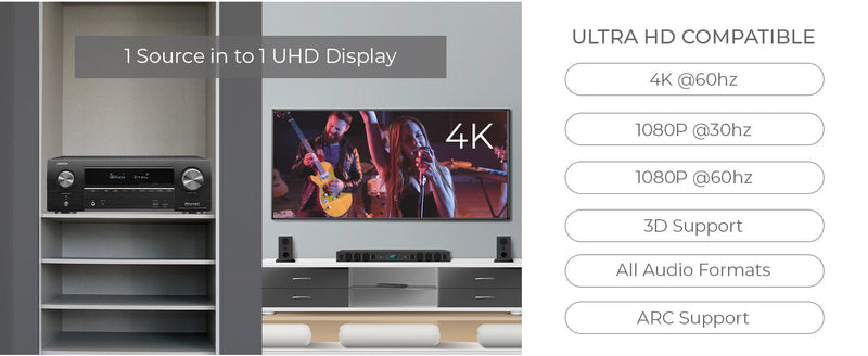 ARC Audio Extraction – Sends audio from an ARC-enabled TV back to a sound system via Optical or HDMI IN.