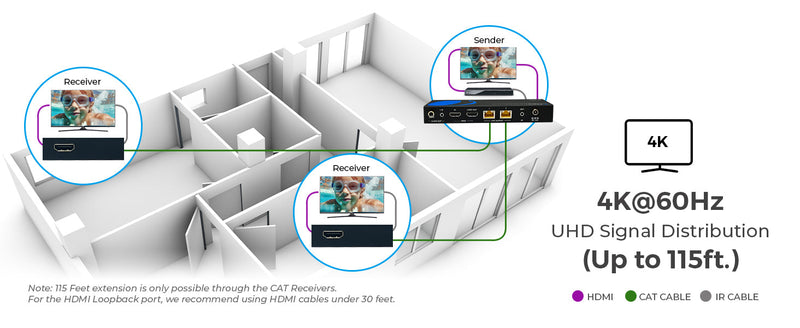 The UHD12-EX115-K HDMI extender splitter transmits high-resolution signals over CAT6/6a/7 cables—up to 115ft at 4K@60Hz and 197ft at 1080p. Whether you're using it in a classroom, digital signage setup, or a conference room, this HDMI extension solution ensures stable, crystal-clear transmission across extended distances without lag or signal degradation.
