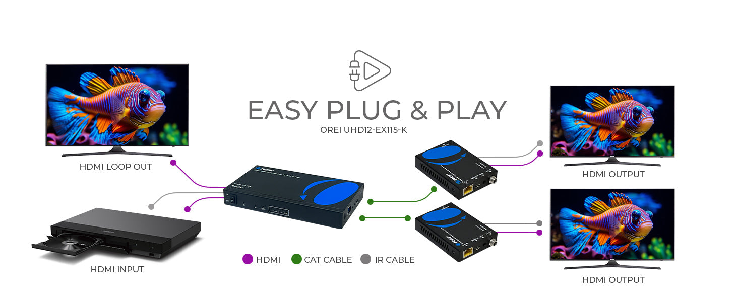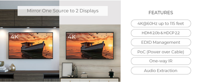 OREI UHD12-EX115-K: 4K 1x2 HDMI Extender Splitter over CAT 6 up to 115 feet with one-way IR control