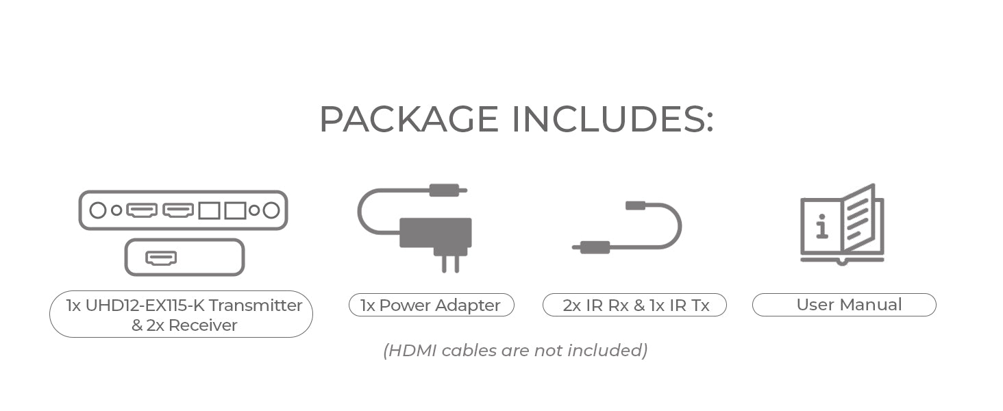 The UHD12-EX115-K HDMI Extender Splitter Kit is a high-performance 1x2 solution that distributes a single HDMI source to two remote displays over long distances via CAT6/6a/7 cable. Supporting resolutions up to 4K@60Hz 4:4:4, this system maintains pristine video quality while offering flexible audio options with coaxial and analog L/R de-embedding at the transmitter.