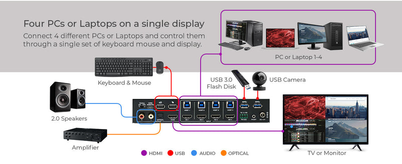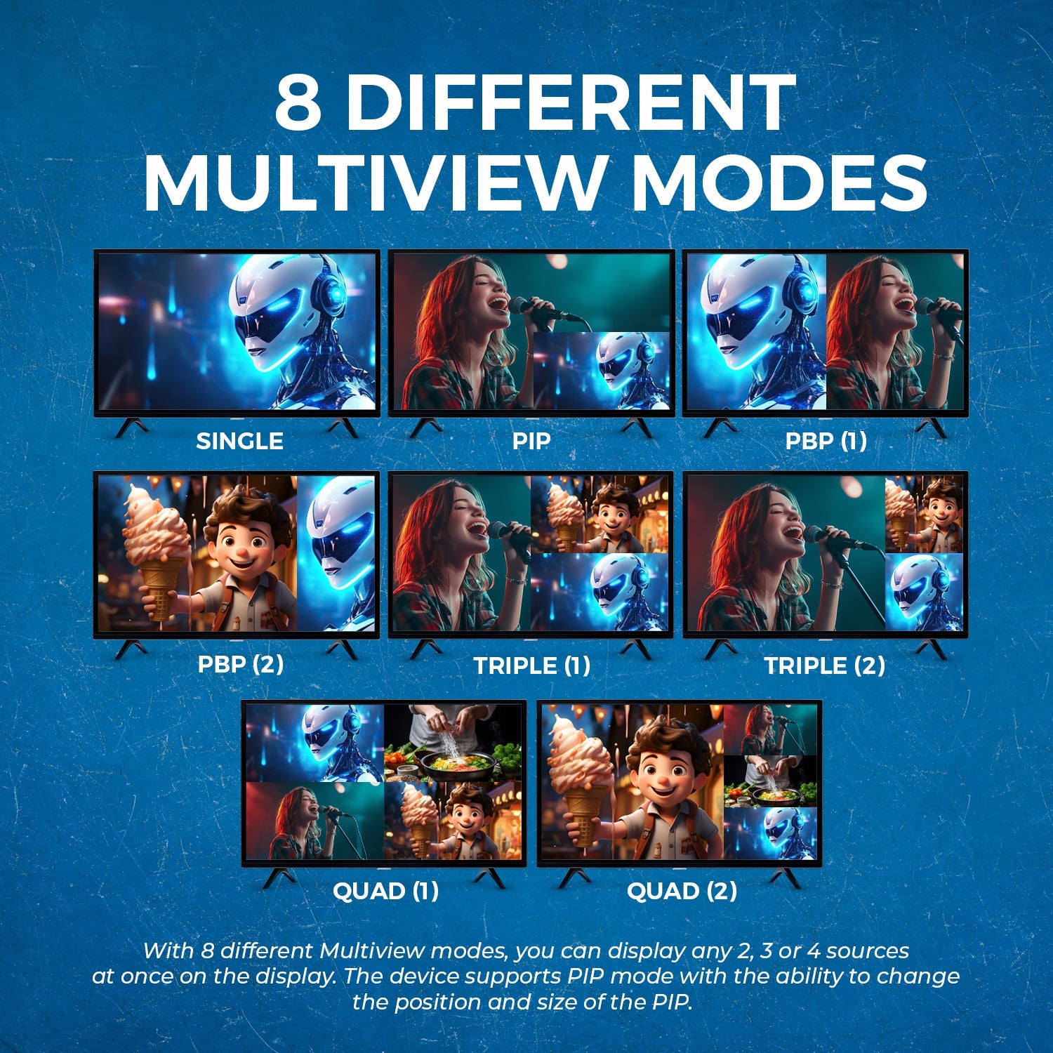 Fully compliant with HDMI 2.0 and HDCP 2.2 standards, it features 7 different multiview display modes and supports audio extraction through both Optical and L/R outputs. With a built-in 3-port USB 3.1 Gen 1 hub, it provides high-speed data transfer and versatile peripheral connectivity.