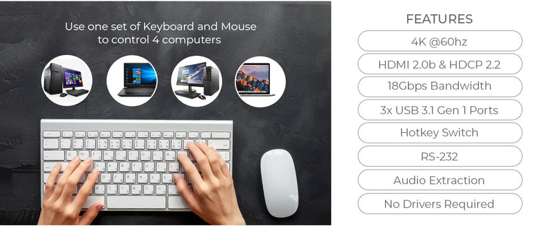 Control is effortless through front panel buttons, IR remote, keyboard/mouse hotkeys, OSD menu navigation, or RS-232 commands. Its compact design ensures easy setup in any environment—ideal for professional workstations, security, or personal productivity setups.