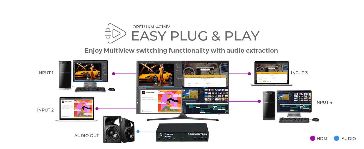 The UKM-401MV is a 4x1 HDMI KVM Multiviewer Switch that allows seamless control of four computers using one keyboard, mouse, and display. Supporting video resolutions up to 4K@60Hz with 18Gbps bandwidth, it ensures crystal-clear visuals and responsive switching.