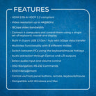 Equipped with EDID management and HDCP 2.2 compliance, this KVM switch HDMI ensures smooth communication between sources and displays. Control options include panel buttons, hotkeys, on-screen display (OSD), RS-232, and remote access—delivering unmatched flexibility in both commercial and personal setups.