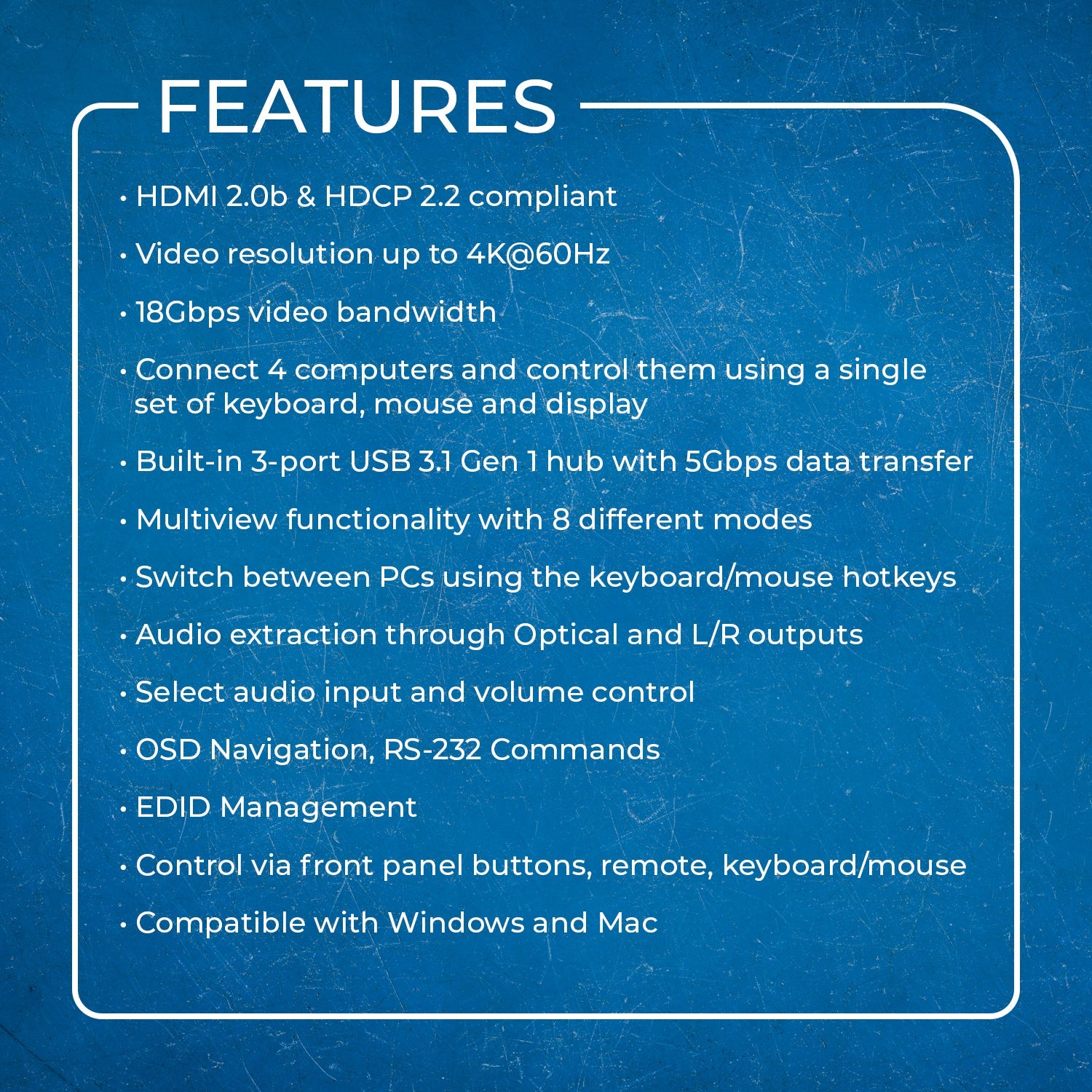 The UKM-401MV combines powerful video processing with intuitive KVM functionality, allowing you to manage four computers using a single keyboard, mouse, and display. Supporting resolutions up to 4K@60Hz and delivering an 18Gbps video bandwidth, this HDMI 4K multiviewer ensures crisp, lag-free visuals—ideal for control rooms, security centers, and advanced workstations.