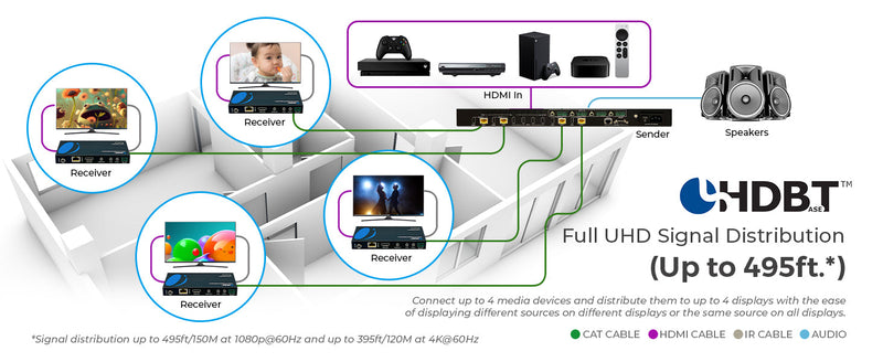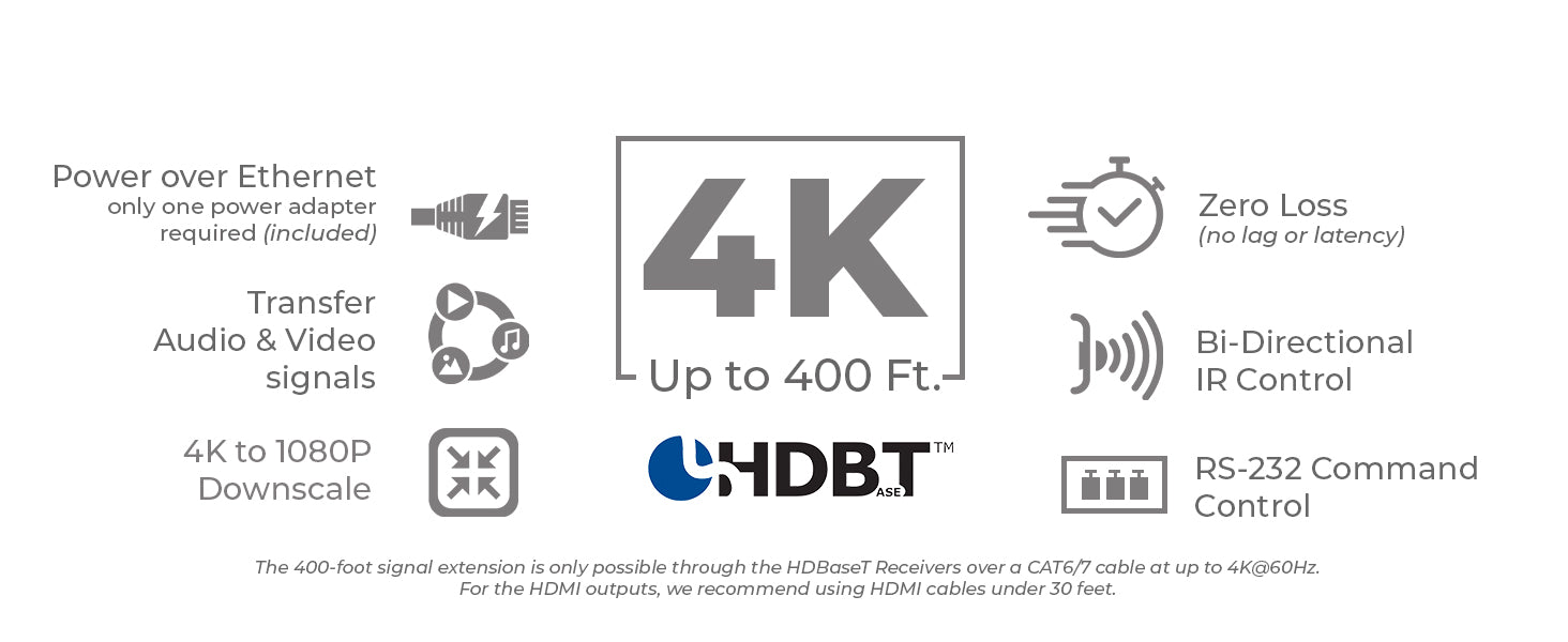 HDBaseT Transmission up to 150m (1080p) or 120m (4K) – Reliable long-distance transmission over Cat 5e/6/7 cables.