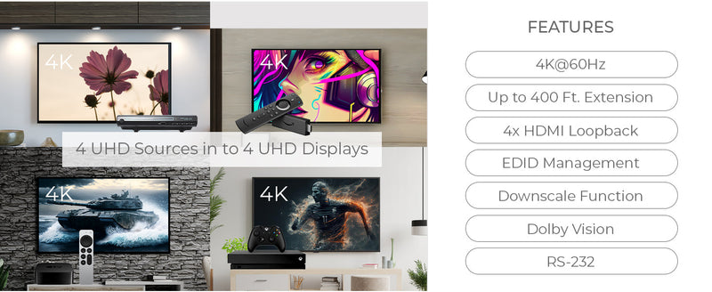 4K HDBaseT 4x4 HDMI™ Extender Matrix (Loop) - 400ft (cat6)-UHD44-EXB400R-K