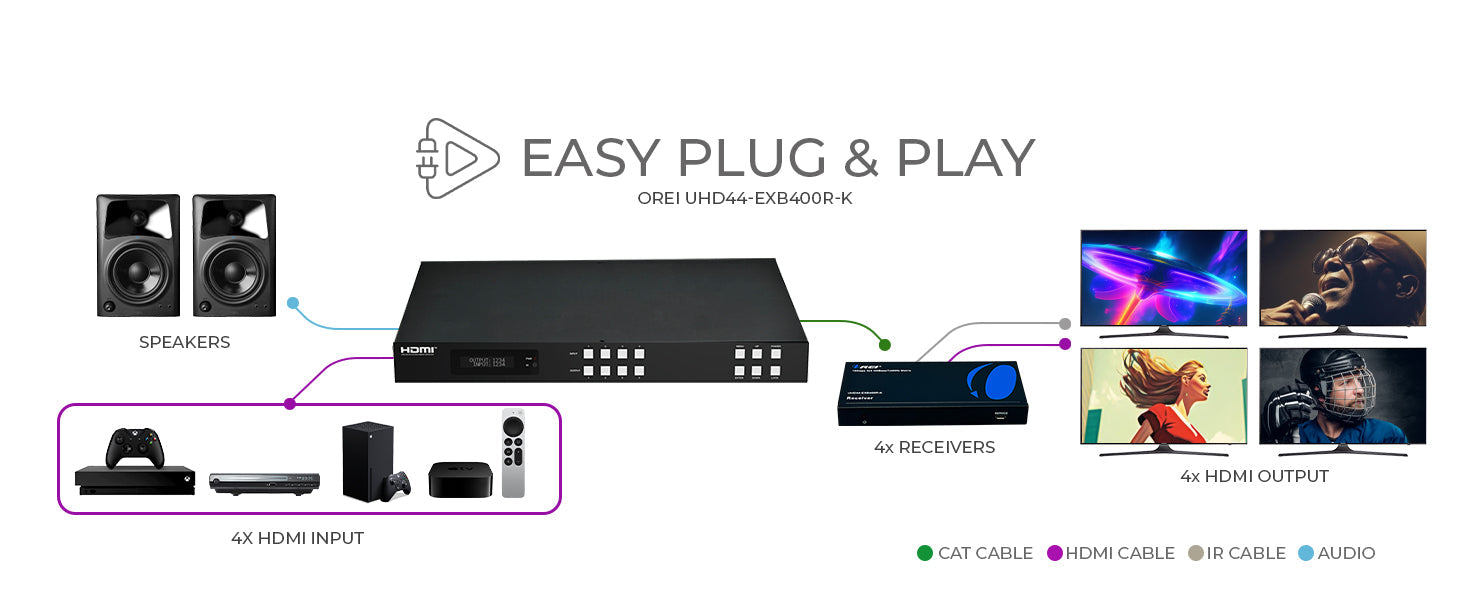 The UHD44-EXB400R-K is a professional-grade 4x4 HDMI matrix extender designed to route four HDMI sources to up to eight displays—four via HDMI and four via mirrored HDBaseT. This versatile HDMI matrix solution is perfect for professional AV installations that demand high performance, flexible routing, and extended reach without signal degradation.