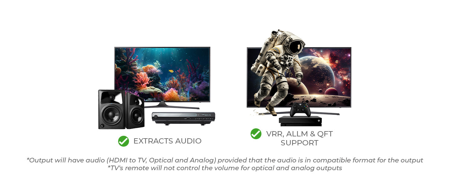 Extract high-fidelity sound from both HDMI inputs or ARC-enabled TVs with simultaneous output to analog stereo and S/PDIF optical. Compatible with Dolby Atmos, Dolby TrueHD, DTS:X, and more, this unit works flawlessly as an eARC HDMI audio extractor—including use with systems like Sonos Arc.