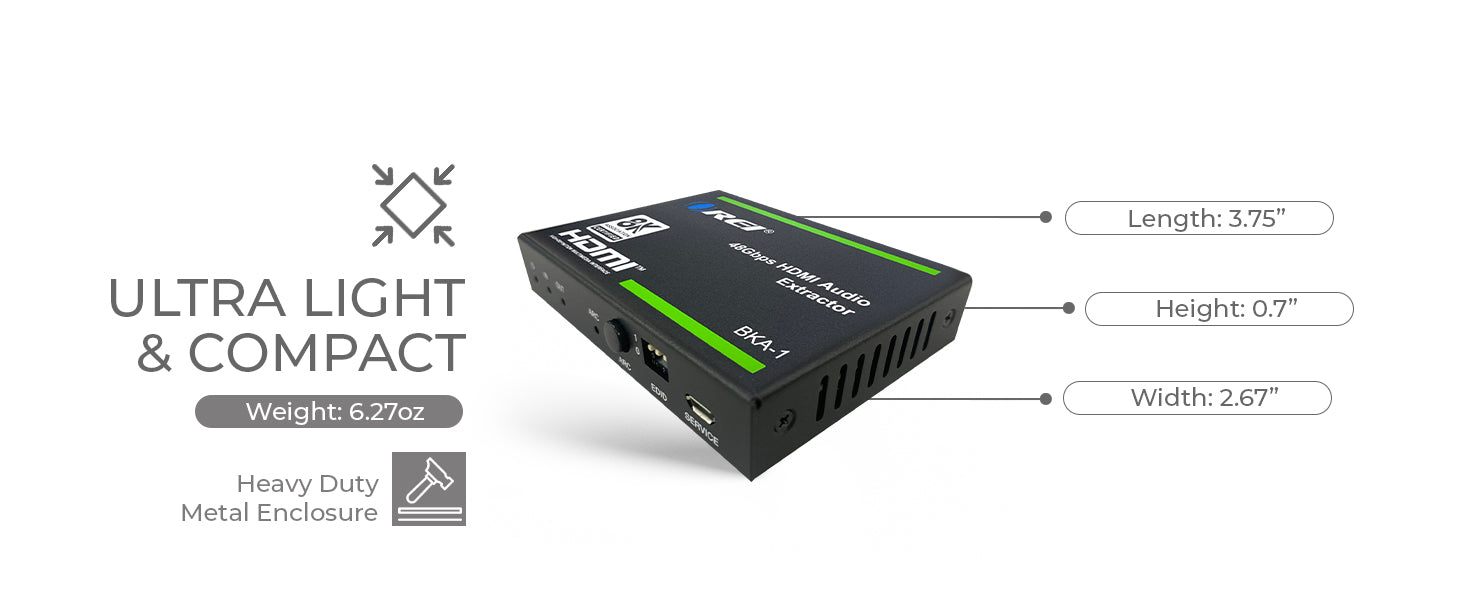 The BKA-1 HDMI 2.1 Audio De-Embedder is a compact and versatile solution for extracting high-quality audio from the latest 8K HDMI sources or ARC-enabled TVs. Supporting up to 48Gbps FRL bandwidth, this unit is fully compliant with HDMI 2.1 and HDCP 2.3, making it suitable for modern Ultra HD installations with high-frame-rate video like 8K@60Hz and 4K@120Hz.