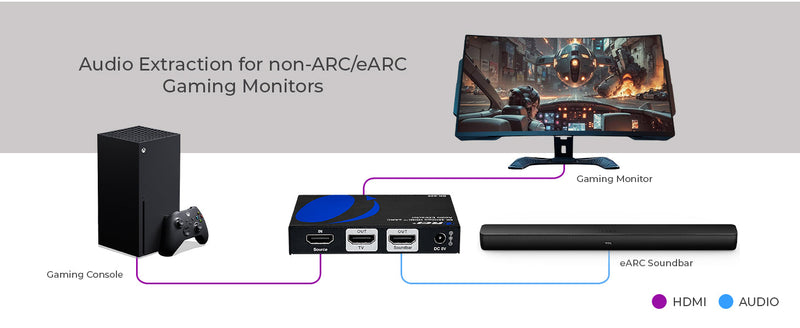 With a plug-and-play form factor, this eARC 8K HDMI audio extractor easily integrates into any AV environment. Audio is extracted only from HDMI sources (not TV apps), making it the perfect solution for media players, gaming consoles, and Blu-ray systems needing HDMI to eARC audio routing.