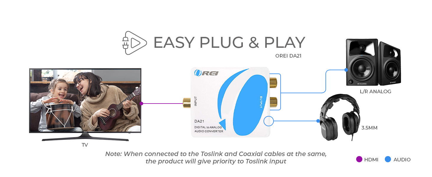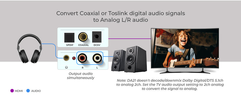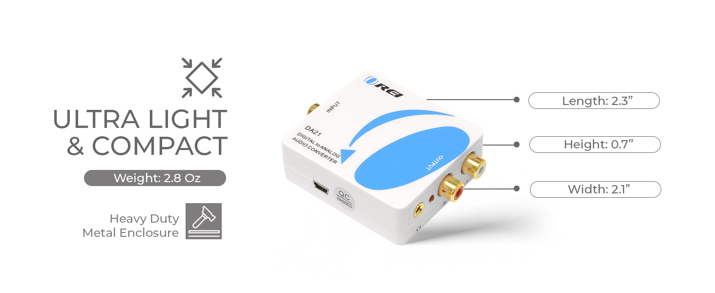 Engineered for noise-free performance, the DA21 includes electromagnetic interference protection, ensuring a clean audio signal. Its lightweight, compact design fits easily into any AV setup, offering reliable performance as a digital audio converter for modern and legacy devices alike.