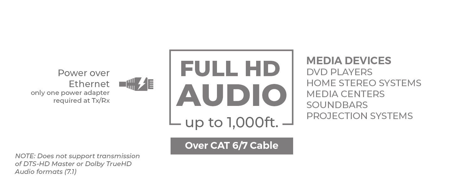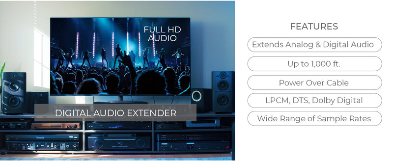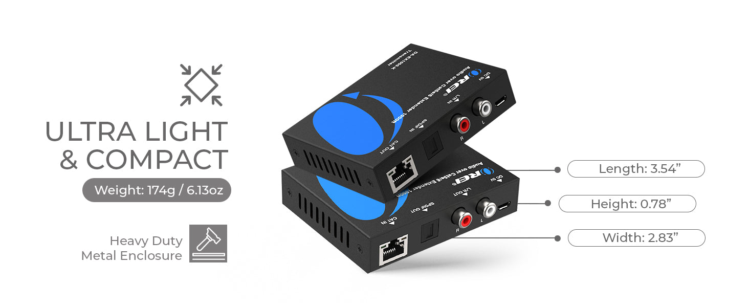 - Long-Distance Audio Extension over CAT Cable – Transmits optical and analog audio signals up to 300m (990ft) at 48kHz, 150m (495ft) at 96kHz, and 100m (330ft) at 192kHz using a single CAT5E/6 cable.