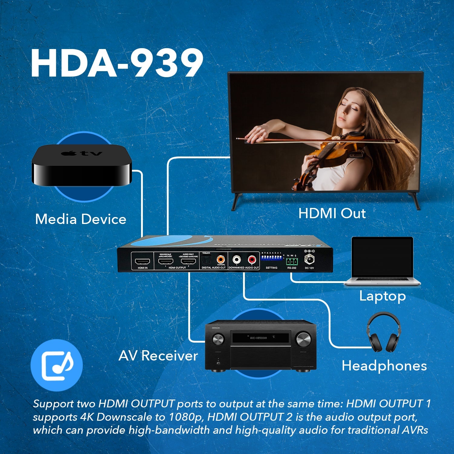 HDA-939 is a professional-grade audio and video processor designed to extract and downmix HDMI audio for maximum flexibility. It supports decoding of Dolby Digital, Dolby Digital Plus, Dolby TrueHD, DTS, and DTS-HD Master Audio and outputs 2CH LPCM through analog, coaxial, and optical ports. HDMI OUTPUT 1 supports video resolutions up to 4K@60Hz 4:4:4 with automatic downscaling to 1080p, while HDMI OUTPUT 2 serves as an audio-only output delivering high-bandwidth audio to traditional AVRs. ARC/eARC functionality allows audio to be returned from a connected TV and routed to external sound systems. Audio can be extracted without connecting any HDMI display. With advanced EDID management, API command support, DIP switch settings, and simultaneous multi-port audio output, the HDA-939 is ideal for modern AV setups requiring precise audio routing, downmixing, and video compatibility.